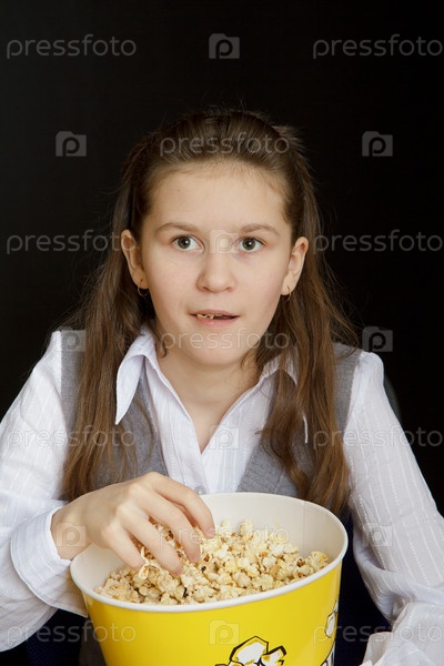 Эмоциональная девушка с попкорном на черном фоне