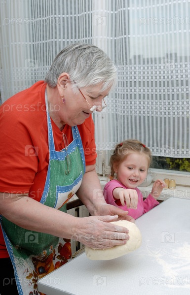 Бабушка и внучка месят тесто