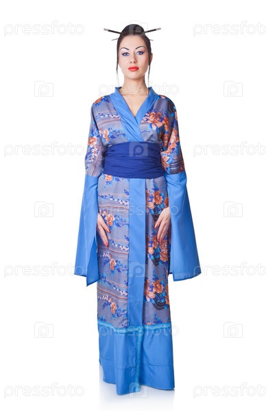Молодая женщина в японском кимоно на белом фоне