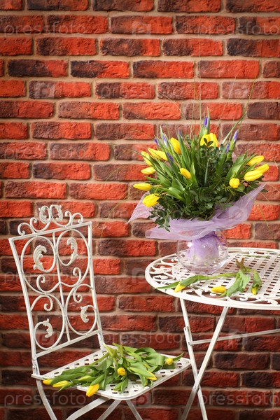 Букет цветов на металлическом столе на фоне стены из красного кирпича