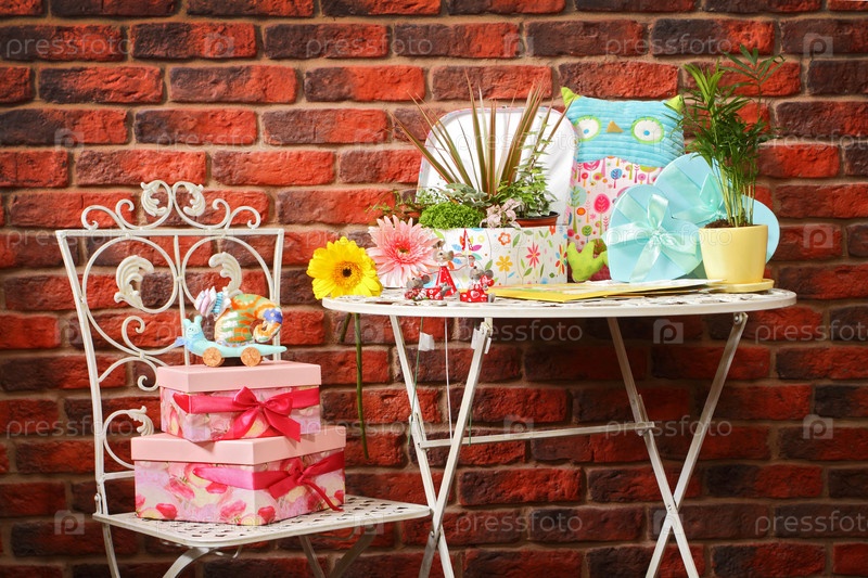 Цветы и подарки на металлическом столе на фоне стены из красного кирпича