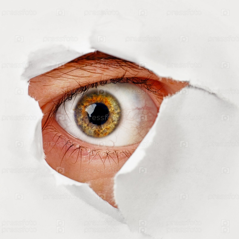 Глаз смотрит через отверстие в бумаге