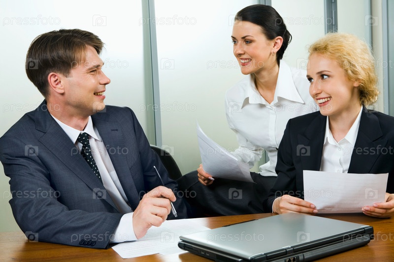 Портрет двух деловых женщин и бизнесмена, сидящих за столом с закрытым ноутбуком, держащими документы и обсуждающих вопросы