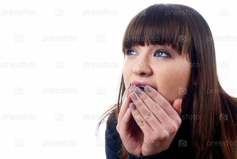 Удивленная молодая девушка на белом фоне