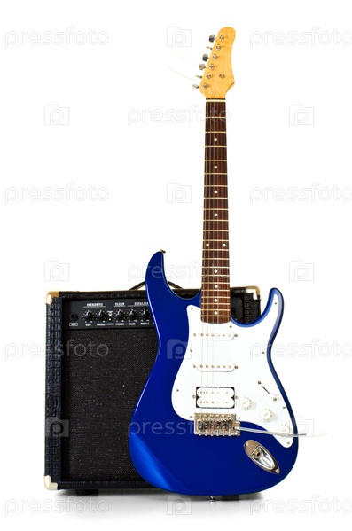 Электрическая гитара стоит перед усилителем, изолированный на белом