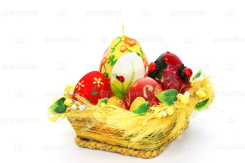 Пасхальные яйца и свеча в корзине, изолированные на белом фоне