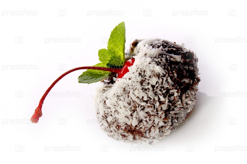 Пирожное с вишней и листочком мяты на белом фоне