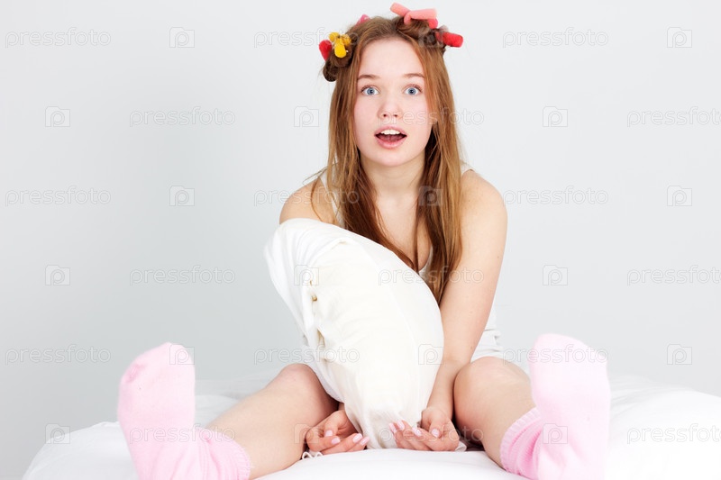 Привлекательная девушка в бигуди сидит на кровати