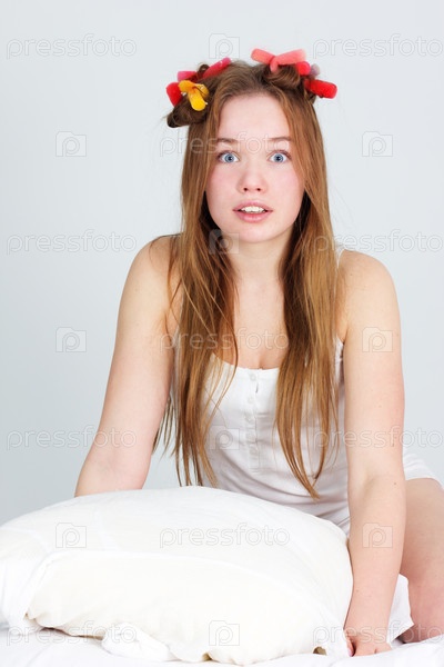 Привлекательная девушка в бигуди сидит на кровати