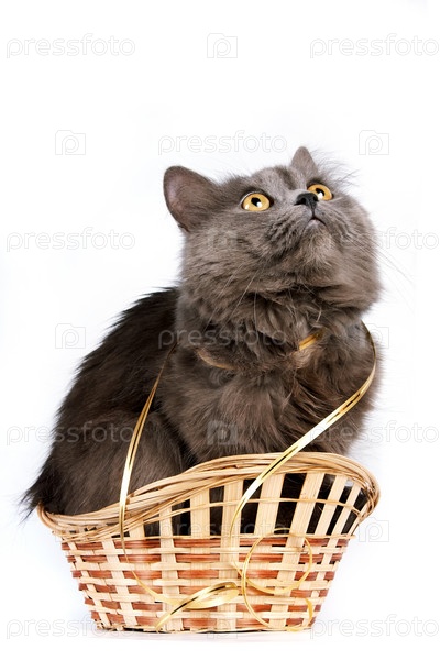Серый кот с желтыми глазами в корзине