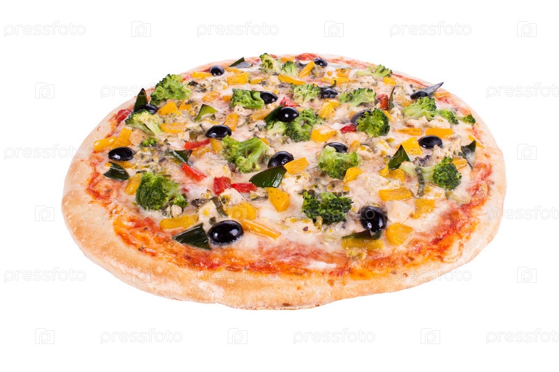 Вегетарианская пицца с оливками, перцем, шпинатом, зеленью и брокколи на белом фоне
