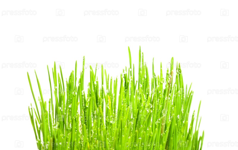 Зеленые веточки пшеницы с каплями росы на белом фоне