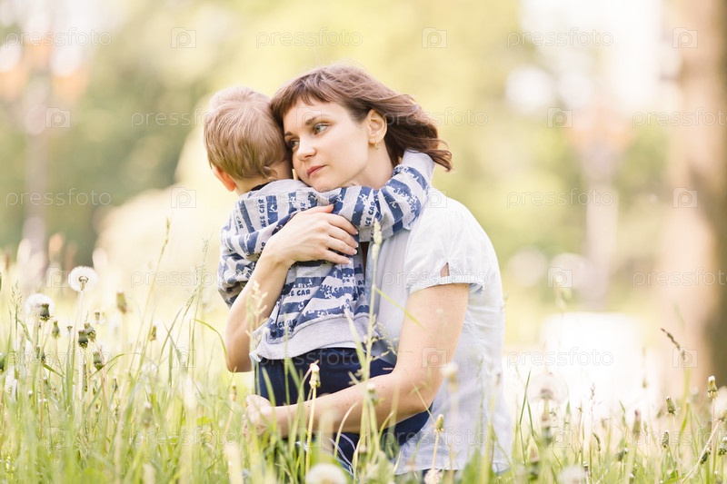 Мать, обнимая ее маленького сына в весенний день