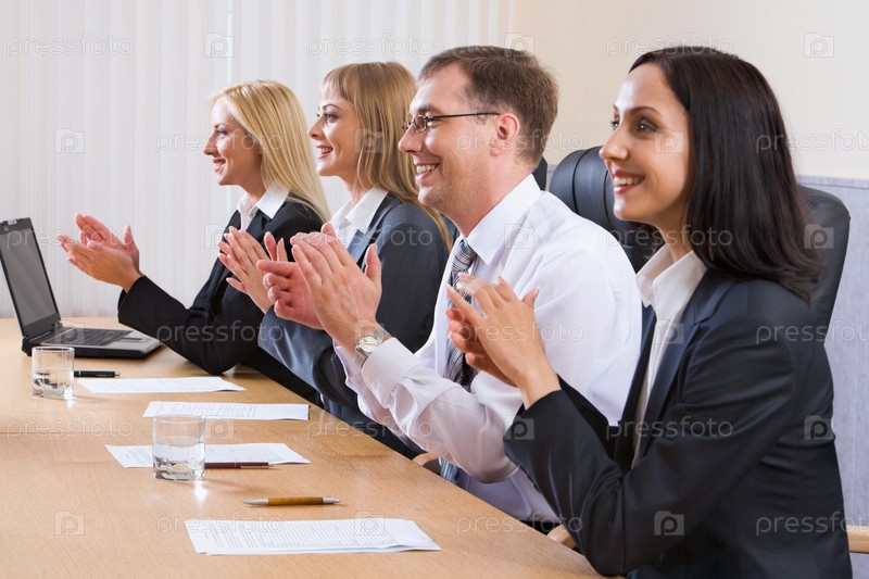 Портрет успешных аплодирующих молодых людей, сидящих в очереди на черных удобных стульях за столом с монитором, бумагами и стаканами воды