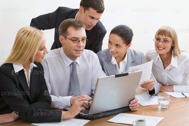 Группа из пяти молодых бизнесменов собралась вокруг ноутбука, обсуждая интересный вопрос