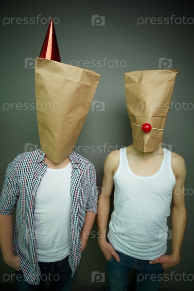 Молодые люди в бумажных пакетах на головах