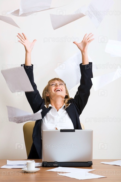 Портрет смеющейся бизнес-жены, бросающей дерьмо из бумаги, сидящей за столом с открытым ноутбуком и белой чашечкой