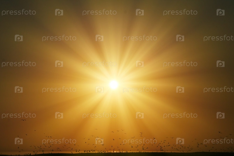 Лучи солнца, птицы, оранжевое небо