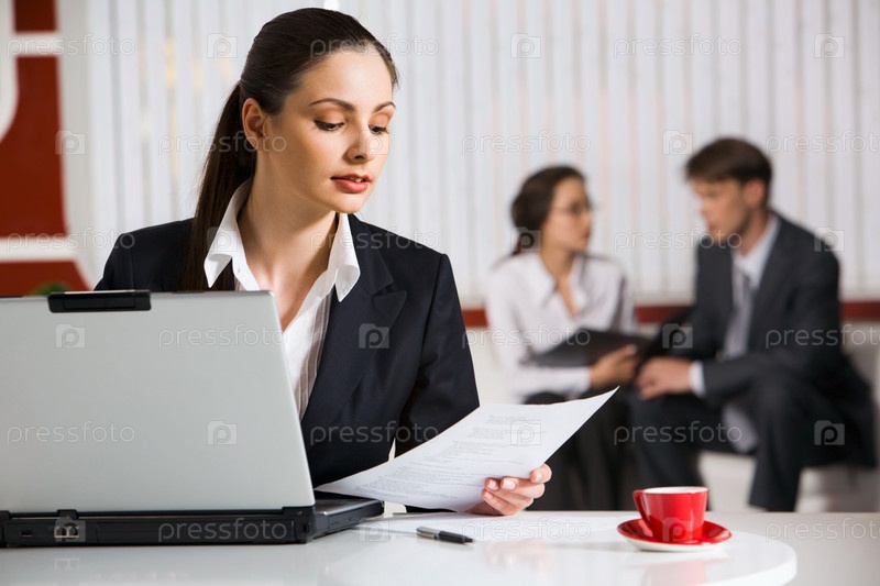 Портрет красивой читающей брюнетки в черном костюме, держащей дерьмо из бумаги и работающей на ноутбуке в офисе с двумя разговаривающими бизнесменами на заднем плане