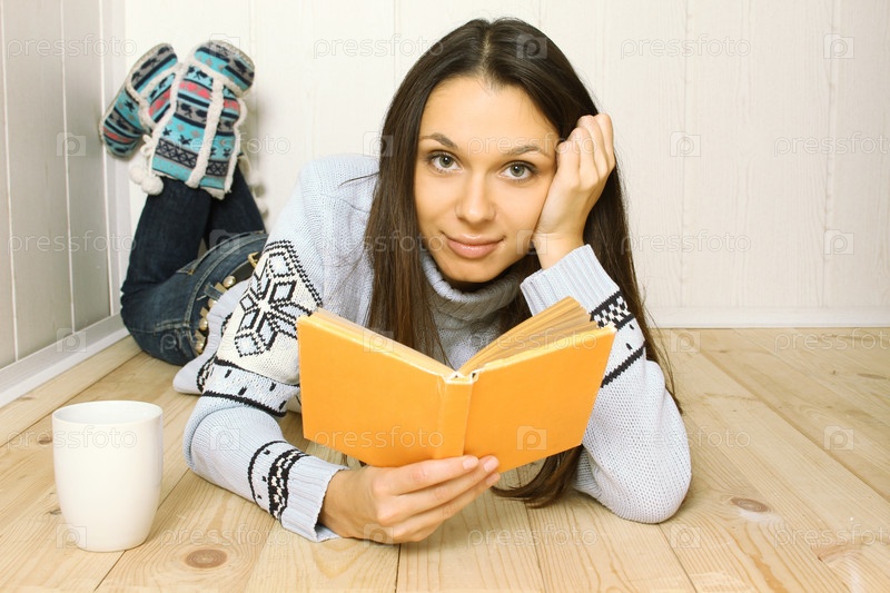 Привлекательная молодая женщина читает книгу, лежа на полу