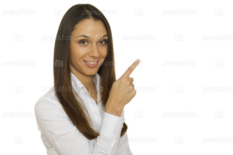 Бизнес-леди показывает пальцем в сторону, изолированная на белом фоне