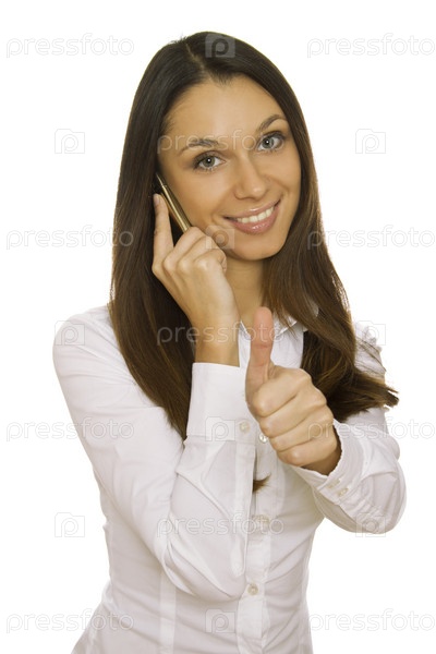Привлекательный современный предприниматель говорит по телефону с большим пальцем вверх, изолированная на белом фоне