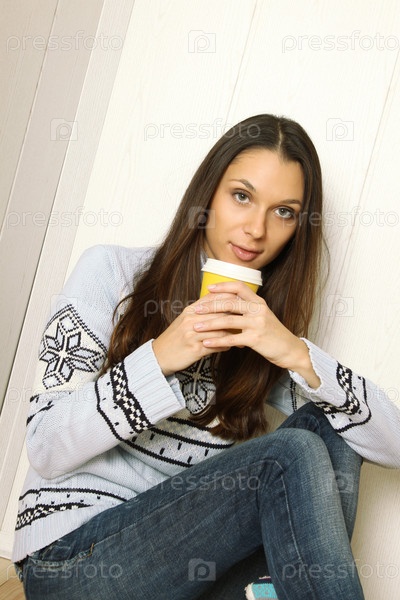 Привлекательная девушка в теплом свитере пьет кофе у себя дома