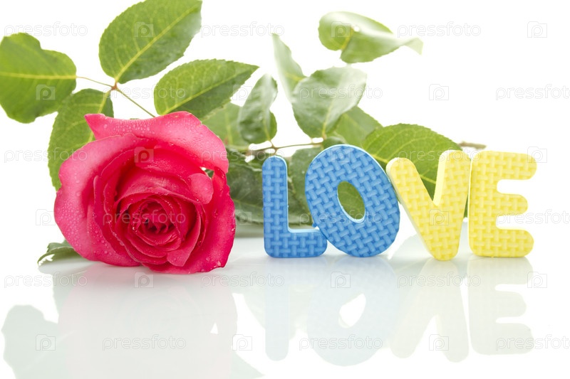 Красивая красная роза и текст ЛЮБОВЬ, изолированные на белом фоне