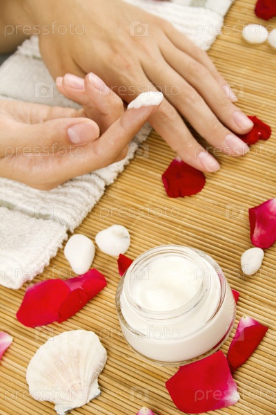 Женские руки с кремом на полотенце среди розовых лепестков