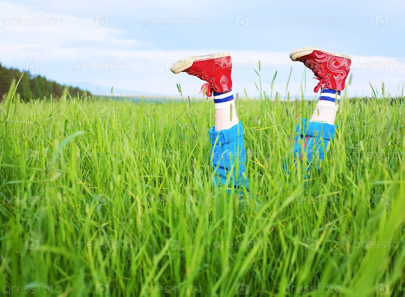Ноги в красных кроссовках смешно выступают из травы наверх