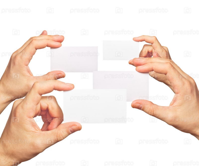 Визитные карточки в руках на белом фоне