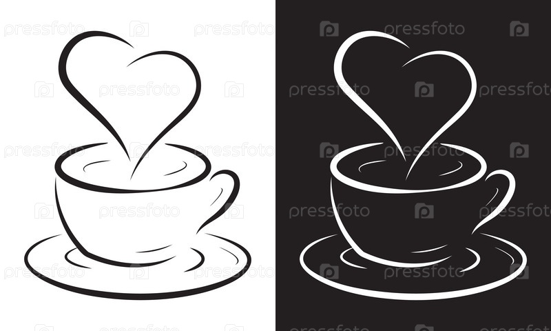 Две чашки кофе с символом сердца, изолированные на черно-белом фоне