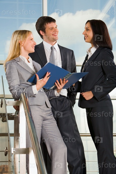Женщина показывает документы своим коллегам на лестнице в здании со стеклянными стенами