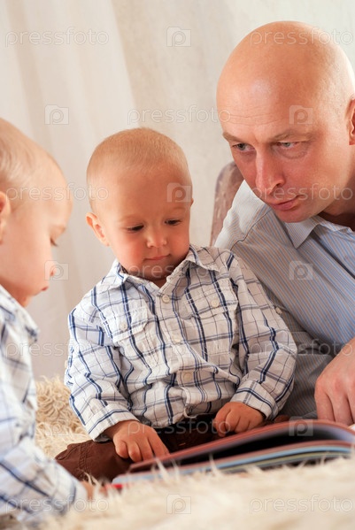 Отец с двумя маленькими сыновьями читает книгу