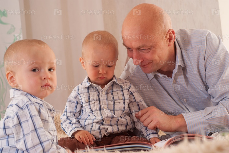 Отец с двумя маленькими сыновьями читает книгу