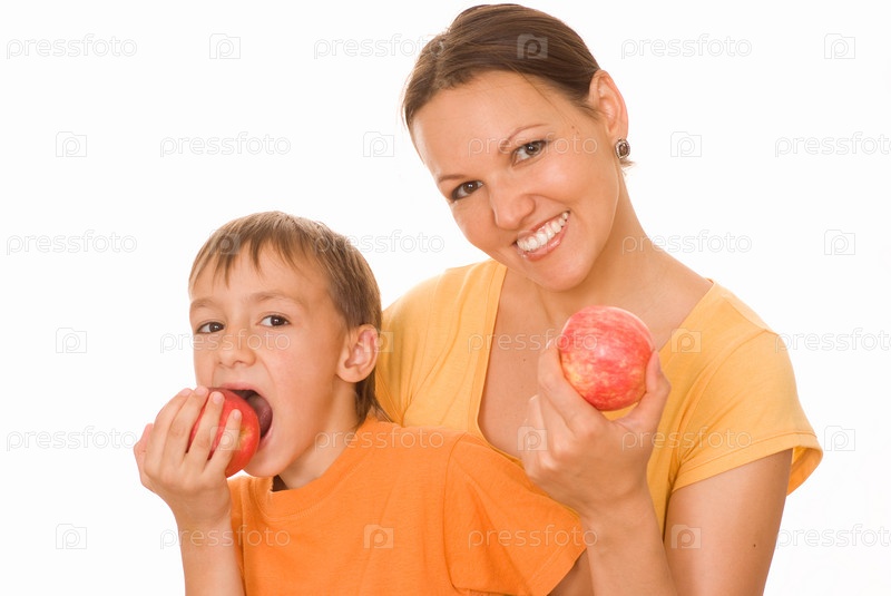 Мать и сын на белом фоне