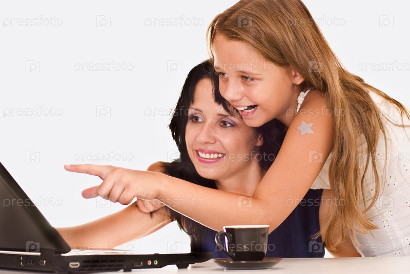 Мама и дочка с ноутбуком на белом фоне