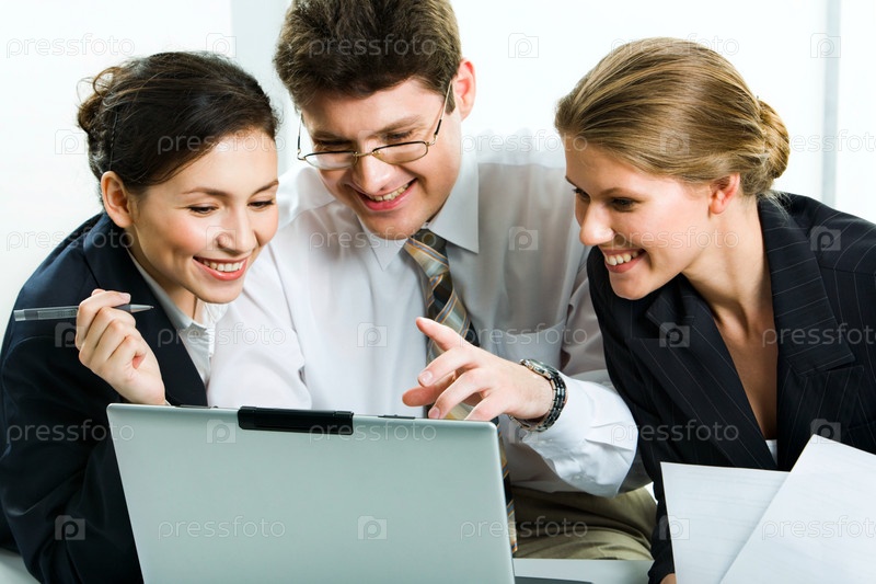 Группа коллег собралась вокруг ноутбука, обсуждая интересный вопрос, жестикулируя и глядя на монитор