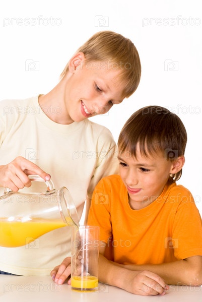 Два брата пьют апельсиновый сок