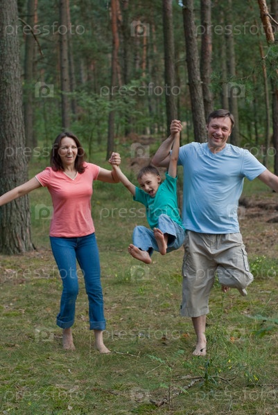 Счастливая семья на прогулке в лесу