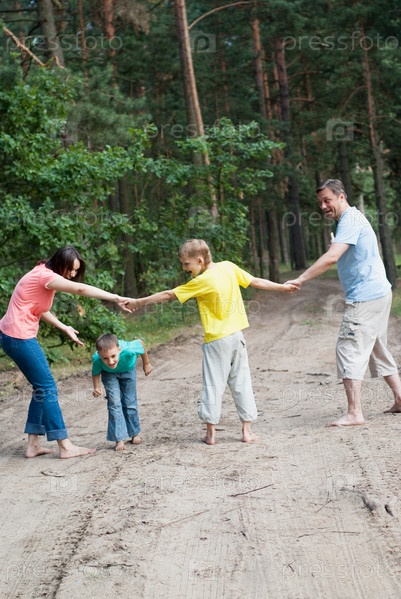 Счастливая семья на прогулке в лесу