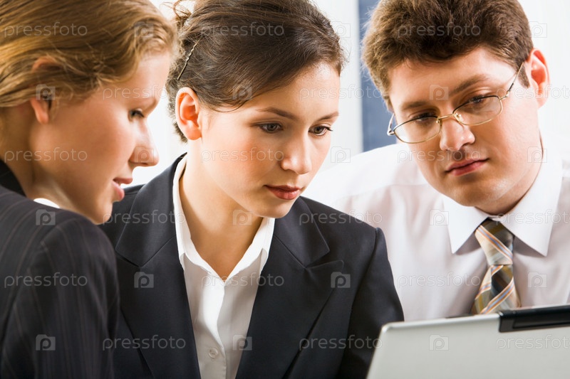 Бизнес-команда, состоящая из мужчины и двух женщин работает над проектом