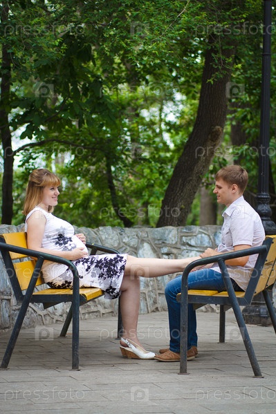 Молодая беременная женщина и ее муж в парке