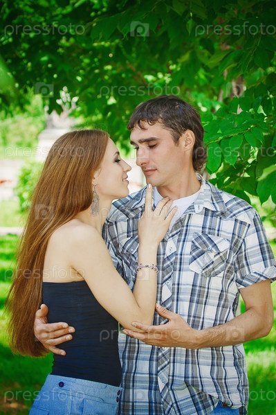 Парень и девушка обнимаются в парке