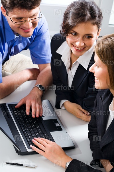 Бизнес-команда, состоящая из мужчины и двух женщин, оптимистично обсуждает стратегию