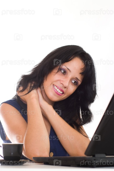 Красивая молодая женщина за ноутбуком на белом фоне