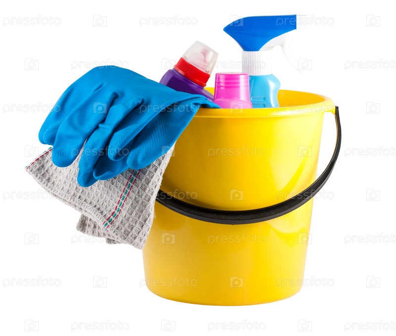 Ведро с перчатками и чистящими средствами