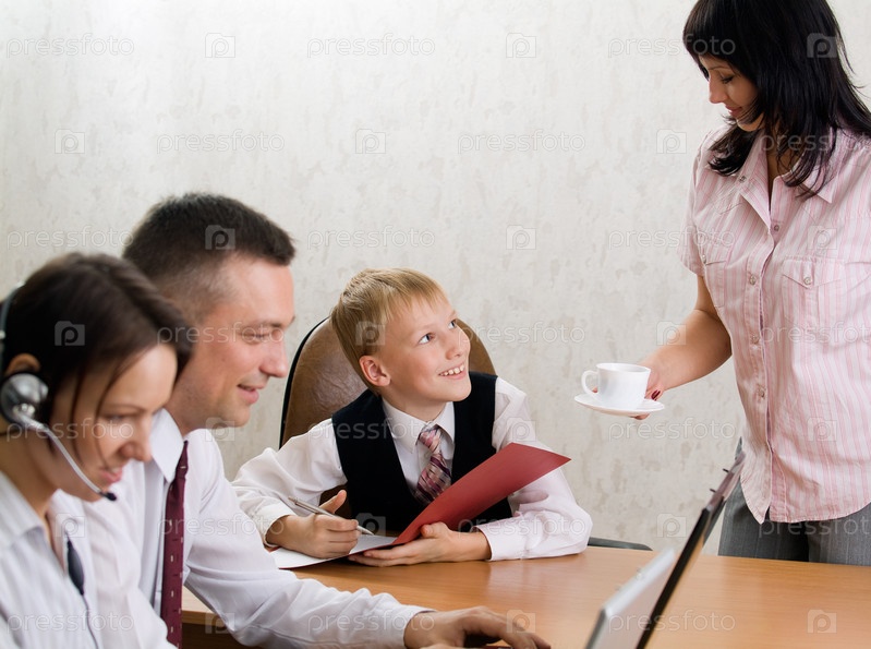 Маленький начальник за столом, окруженный улыбающимися сотрудниками