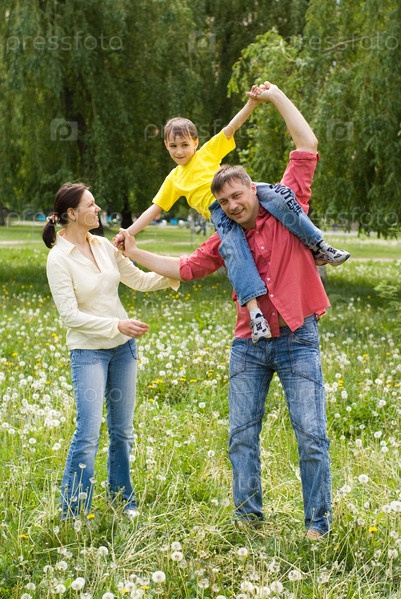 Счастливая семья из трех человек на природе