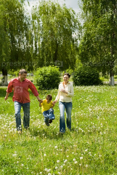 Счастливая семья из трех человек на природе
